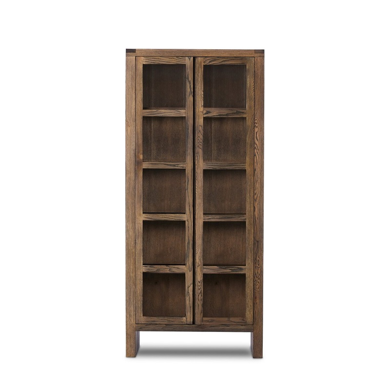 This minimal-inspired bookcase is crafted from a mix of solid oak and worn oak veneer. Featuring glass-front doors and spacious shelves for storage and display.Overall Dimensions: 42.00"w x 18.00"d x 94.00"hColors: Worn Oak VeneerMaterials: Oak Veneer, Sol
