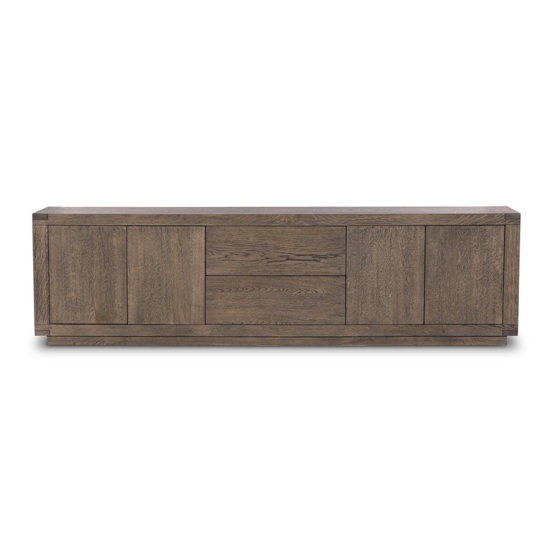 Worn oak shapes a streamlined box-style media console, with lap joint corners for a detail-driven touch.
