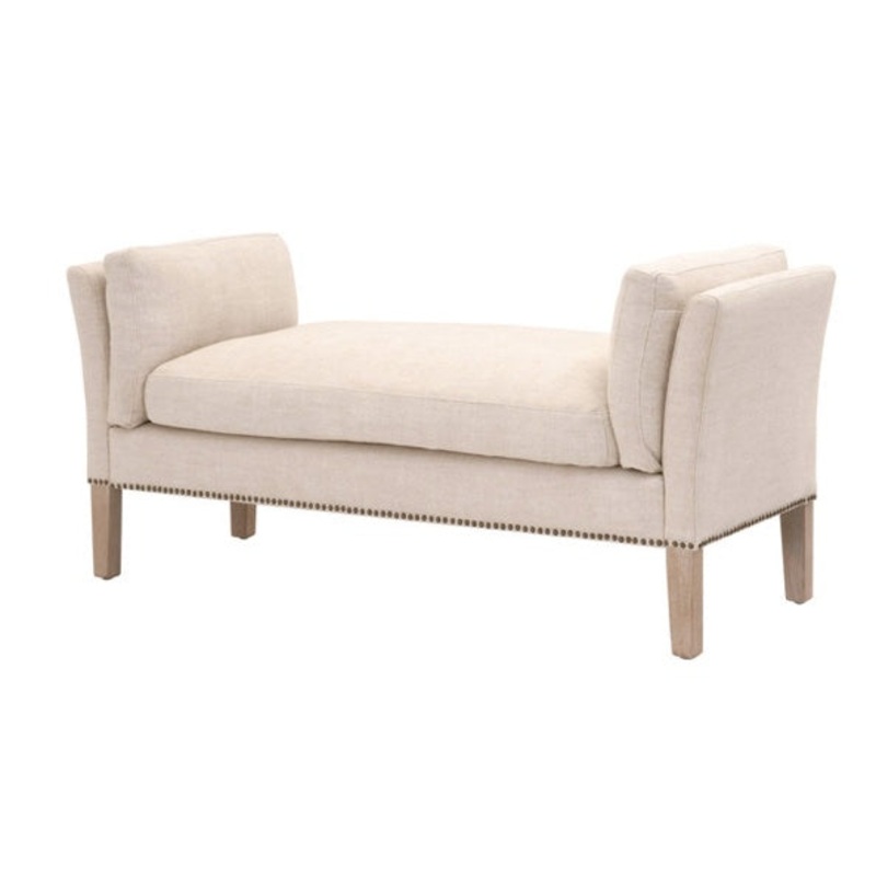 Bisque French Linen, Natural Gray AshSolid Wood LegsIndividual Nail Head DetailVersatile Design & FunctionRemovable CushionsMaterials: Solid Ash Wood, Plywood, 50% Linen/50% Polyester Fabric, FoamHardware: Gold NailsDIMENSIONS:W:60" D:21" H:28".Please call