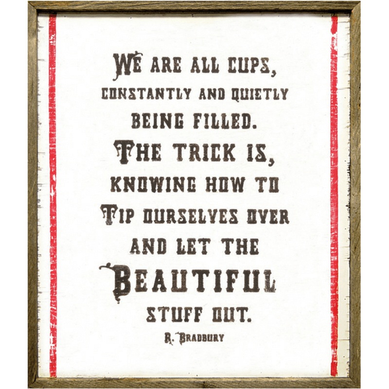 This distinguished art print has a quote from author Ray Bradbury etched on a white background - "We are all cups, constantly and quietly being filled. The truth is, knowing how to tip ourselves over and let the beautiful stuff out." Ray Bradbury wrote wor